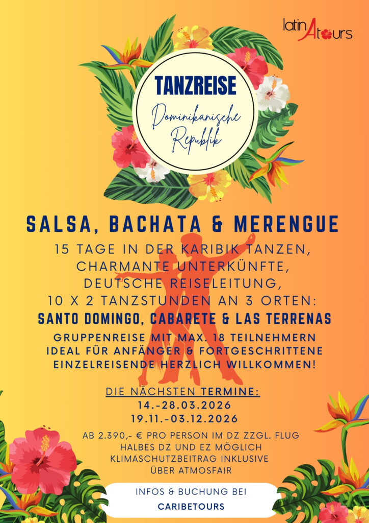 Unsere Tanzreisen bieten Ihnen die einzigartige Möglichkeit, die Dominikanische Republik nicht nur als Tourist, sondern auch als Tänzer zu erleben. Sie werden von erfahrenen Tanzlehrern betreut, die Ihnen nicht nur die Grundschritte beibringen, sondern auch die kulturelle Bedeutung und den Hintergrund der verschiedenen Tänze vermitteln. Tauchen Sie ein in die pulsierende Musik und lassen Sie sich von der Leidenschaft der Einheimischen inspirieren.